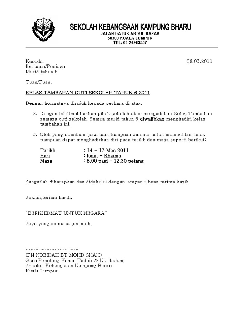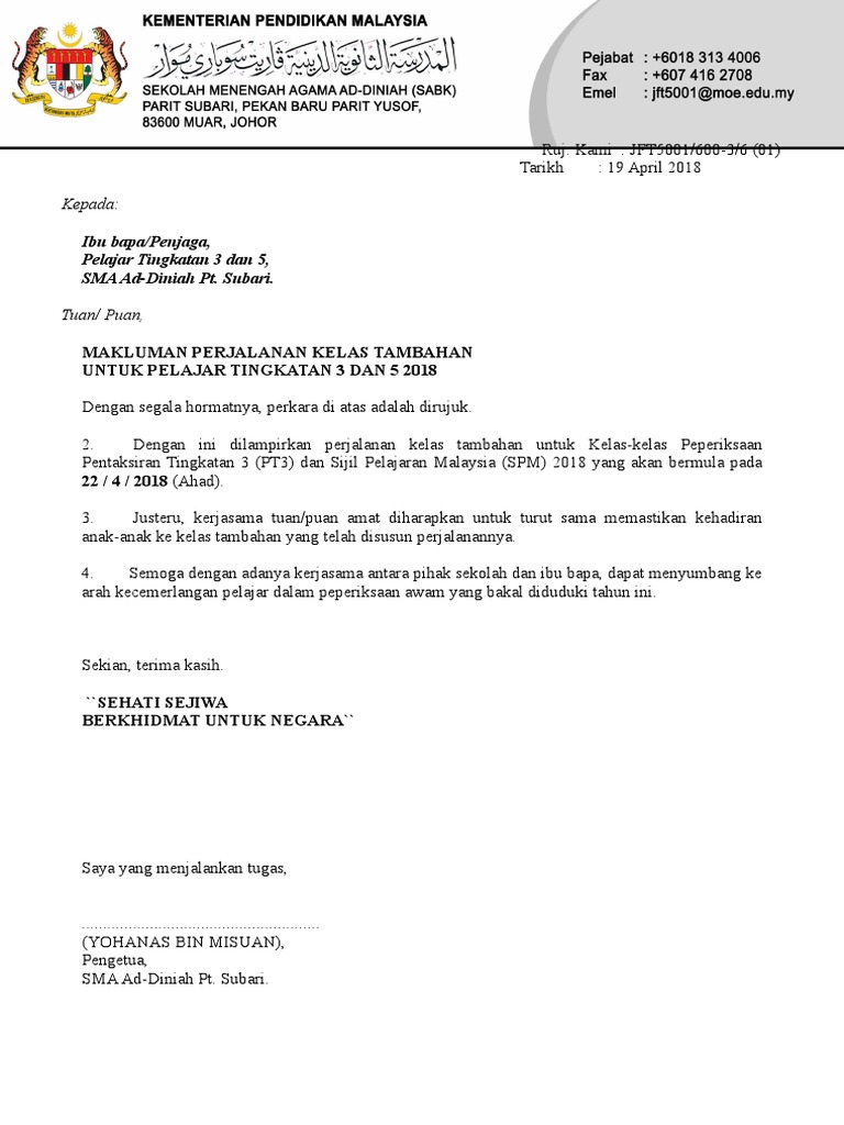 Surat Makluman Kelas Tambahan Pdf