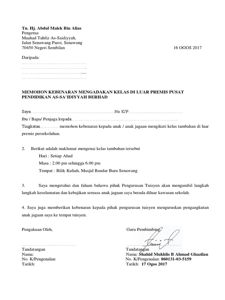 Surat Permohonan Kelas Tuisyen Pdf
